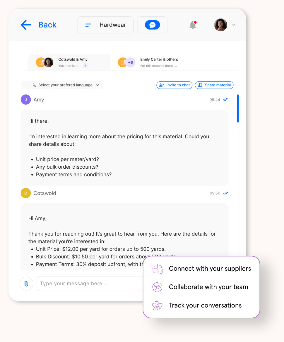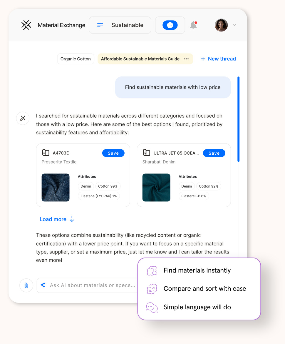 Simplify your sourcing with Frank, fashion's first AI sourcing assistant. Find the right materials, the data you need, and connect with suppliers – all in one place.