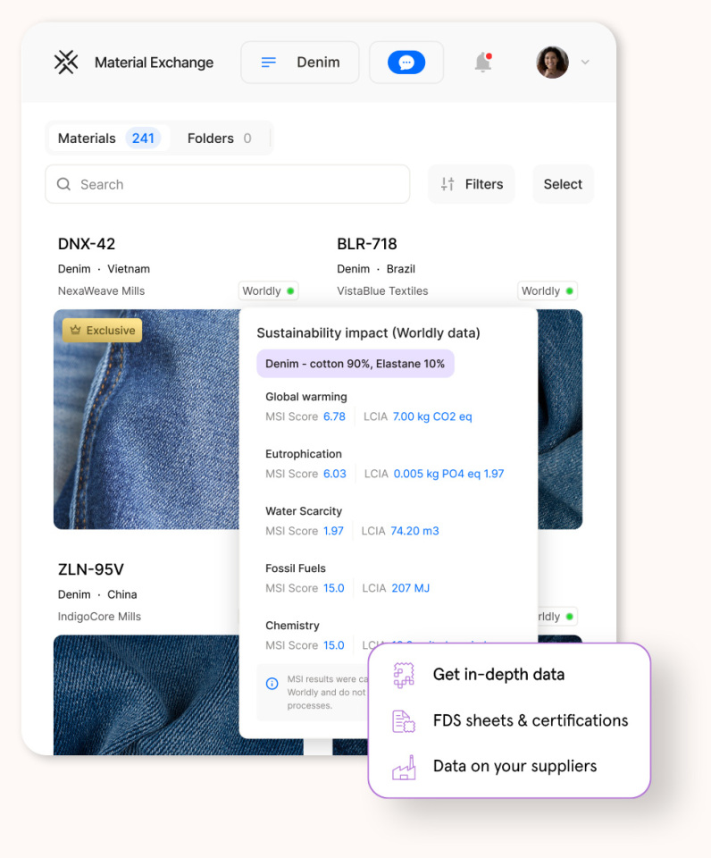 Sustainable sourcing just got a whole lot easier since Frank has teamed up with the planet's leading sustainability data platform, Worldly. Now, brands can access detailed information about the environmental impact of the materials they source and the facilities that create them. Book a demo with us to see Frank and Worldly in action.
