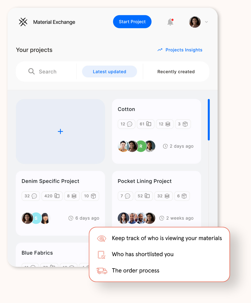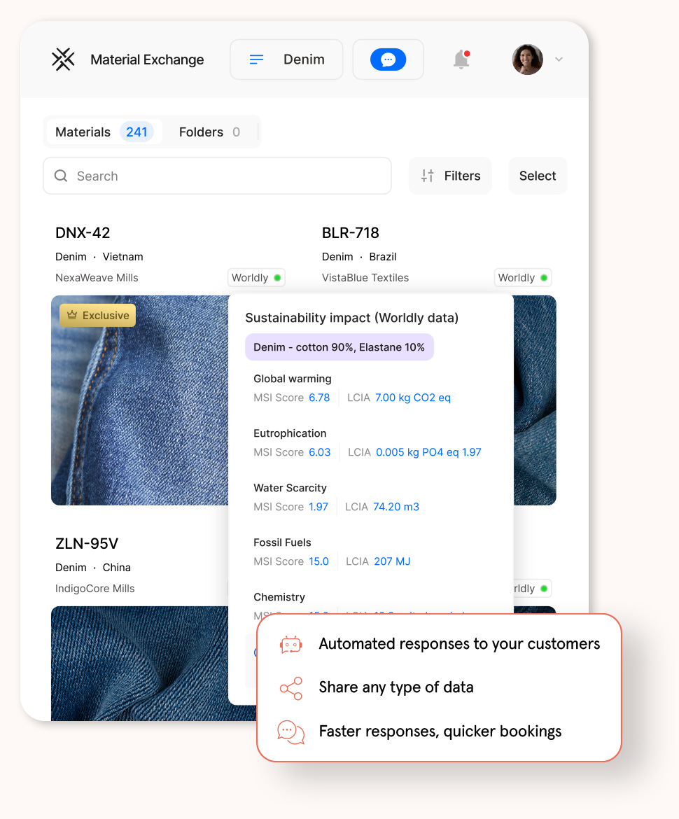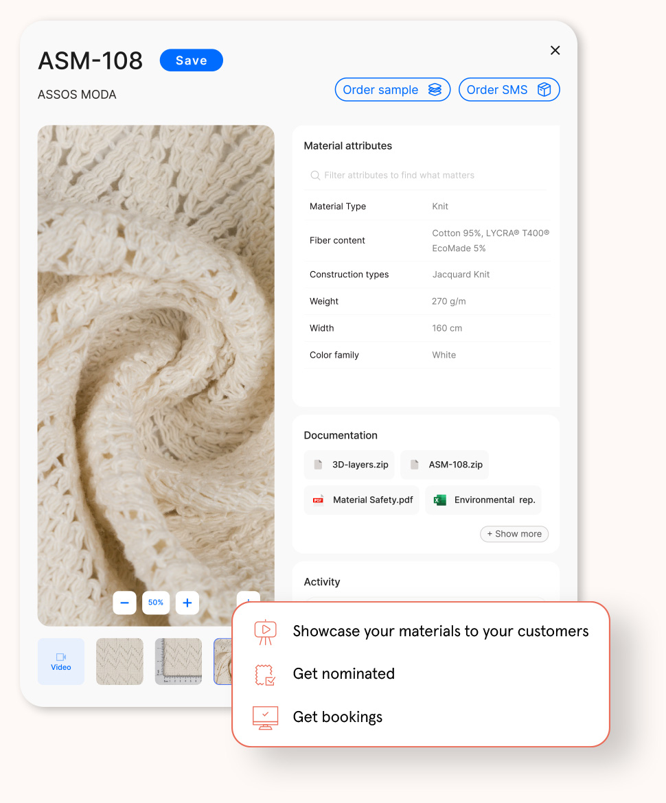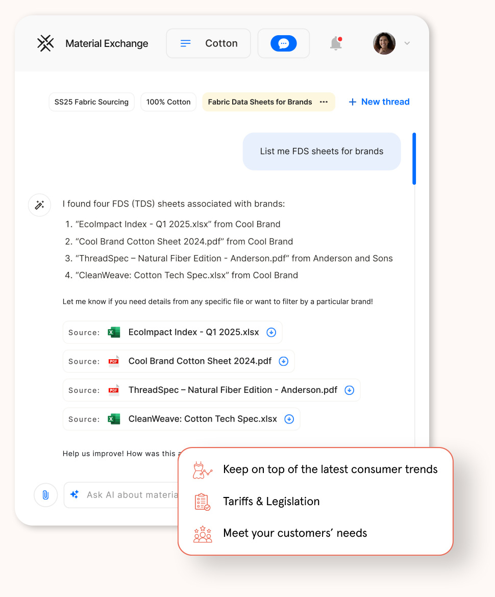 Get your materials into Frank’s knowledge base and be found easier by brands. He can also provide FDS sheets to the brands for you, certifications, and even provide you insights on who’s viewing what, when. Bring Frank into your team and watch your sourcing workload dissolve away.